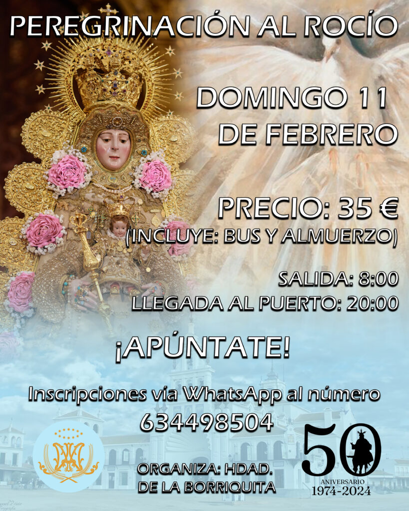 La Hermandad de la Entrada de Jesucristo en Jerusalén y Nuestra Señora de la Entrega, con motivo de su 50 aniversario fundacional y en el marco de actividades, actos y cultos del mismo, organiza una peregrinación a la Ermita del Rocío el día 11 de Febrero.