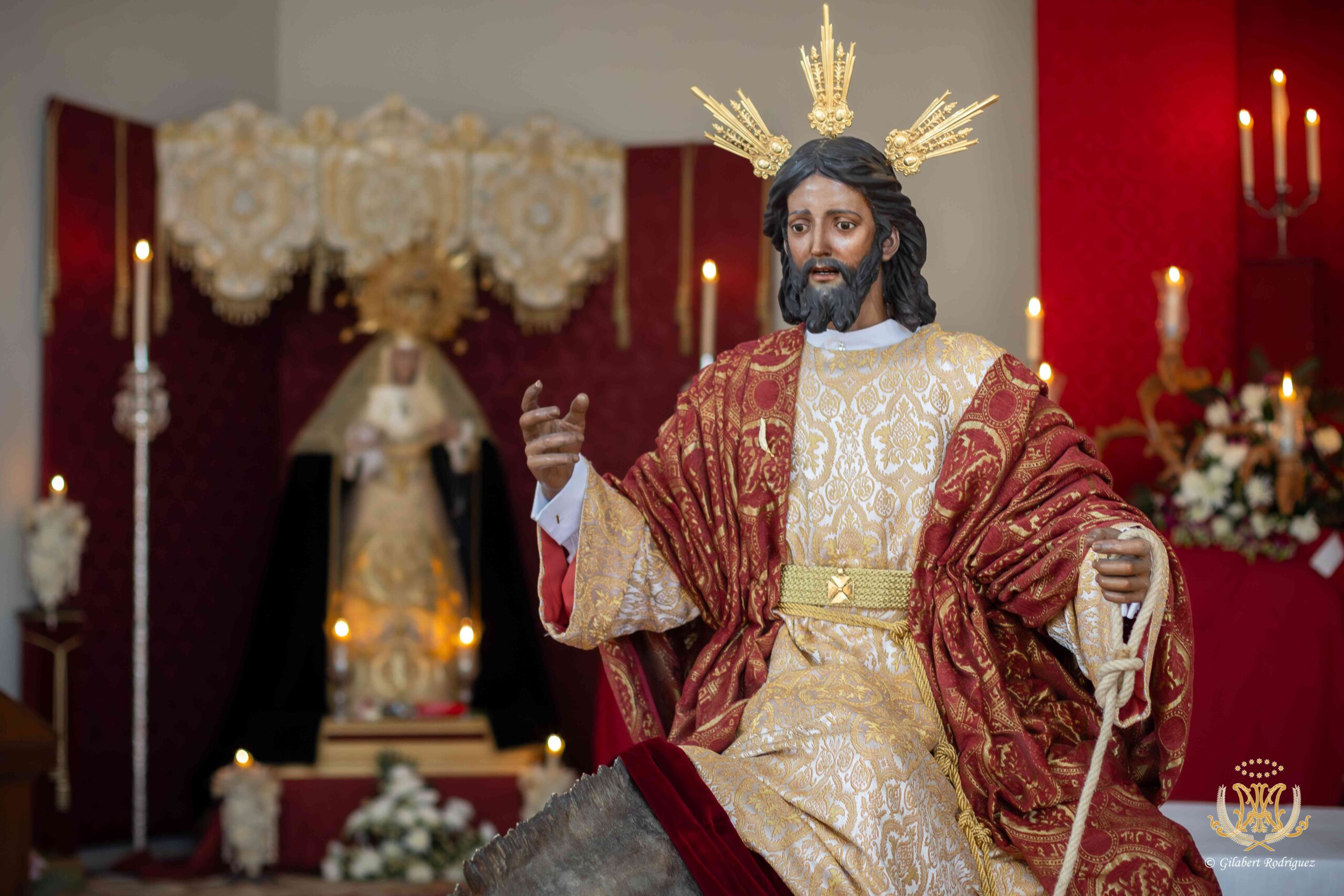 Para esta ocasión tan especial, el Señor luce túnica beige brocada en oro y mantolín de brocado burdeos y dorado. Estrena además camisa interior. Completa su atuendo con las potencias doradas de 1990, símbolo de la realeza y divinidad de Cristo.