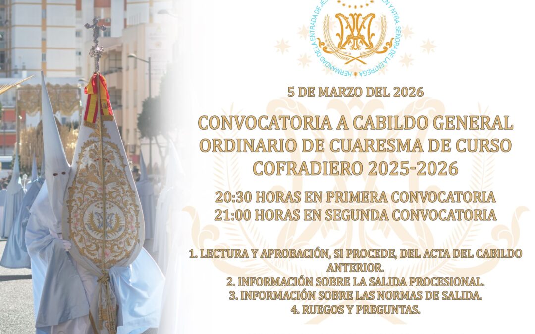 Se convoca a todos los hermanos mayores de 18 años y con, al menos, un año de antigüedad, al Cabildo General Ordinario de Cuaresma, que se celebrará el próximo 5 de marzo de 2025 a las 20:30 horas en primera convocatoria y a las 21:00 horas en segunda, en la Parroquia del Carmen y San Marcos, con el siguiente orden del día: