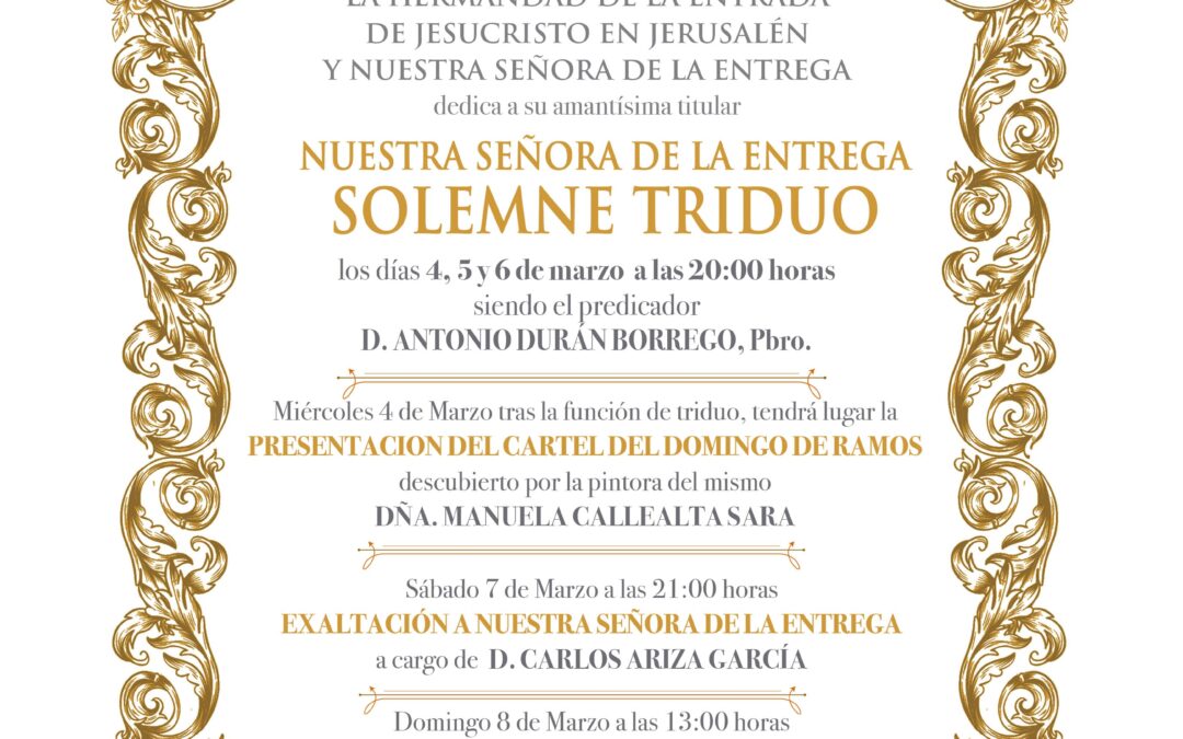 La Hermandad de la Entrada de Jesucristo en Jerusalén y Nuestra Señora de la Entrega celebrará en honor a su Amantísima Titular, Nuestra Señora de la Entrega, los siguientes cultos: